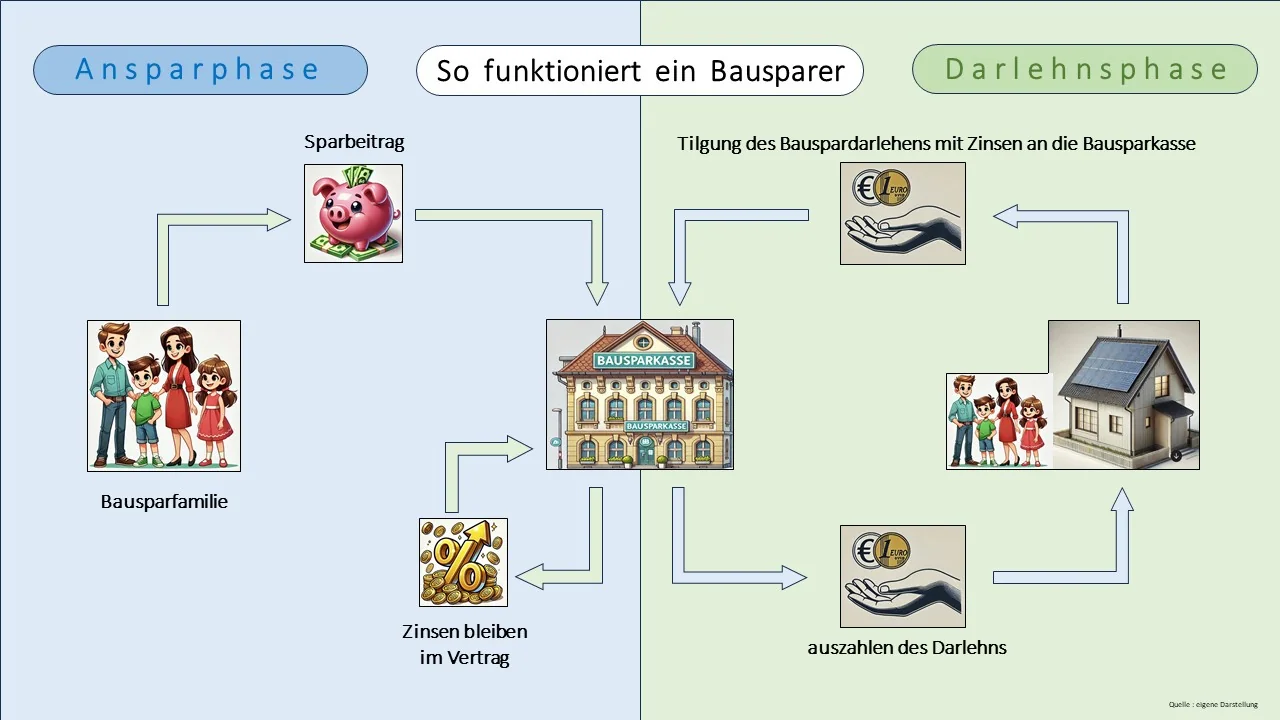 Am Anfang, in der Ansparphase, zahlt der Bausparer regelmäßig Beträge in seinen Bausparvertrag ein. Während dieser Phase wird das angesparte Kapital verzinst. Sobald ein bestimmter Mindestbetrag – meist ein festgelegter Prozentsatz der Bausparsumme – erreicht ist ( i.d.R. 40% oder 50% ) und eine Mindestsparzeit eingehalten wurde ( i.d.R. mind. 3 Jahre ), kommt der Vertrag in die Zuteilungsphase ( Bausparer ist „ zuteilungsreif “ ). In dieser Phase hat der Bausparer die Möglichkeit, das angesparte Guthaben zusammen mit einem zusätzlichen Bauspardarlehen zu nutzen. Das Darlehen bietet meist günstige, festgelegte Zinsen und dient zur Finanzierung eines Immobilienprojekts. Die Darlehensphase beginnt, wenn der Bausparer sich entscheidet, das Darlehen in Anspruch zu nehmen. Während dieser Zeit zahlt der Bausparer das Darlehen in Raten zurück. In dieser Phase kann der Kreditnehmer bei den meisten Tarifen auch Sondertilgungen in beliebigen Höhe entrichten. Der Vertrag mit der Bausparkasse endet, sobald das Darlehen vollständig mit Zinsen zurückgezahlt wurden.